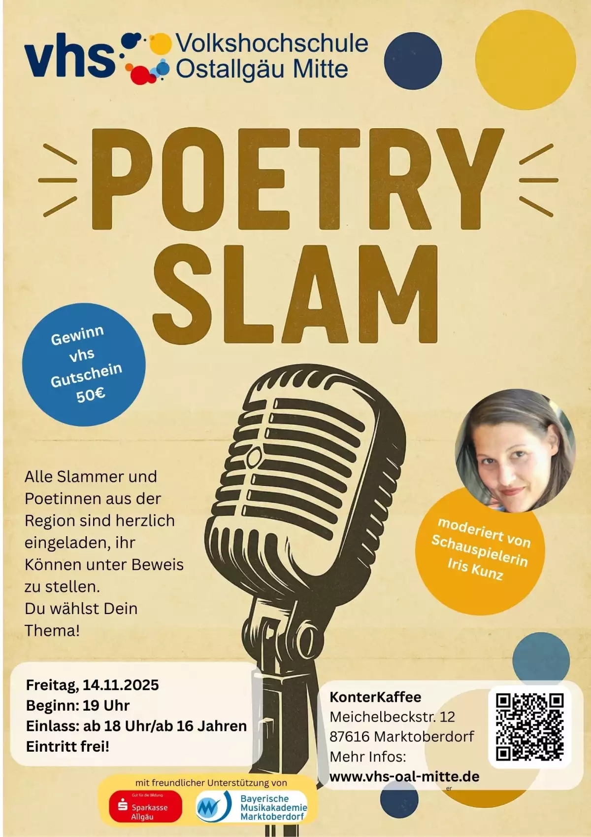 wir laden euch herzlich ein zum 3. Poetry Slam Marktoberdorf der vhs Ostallgäu Mitte mit der Schauspielerin Iris Kunz! Ob als Slammer auf der Bühne oder im Publikum – wir würden uns sehr freuen, wenn ihr dabei seid.